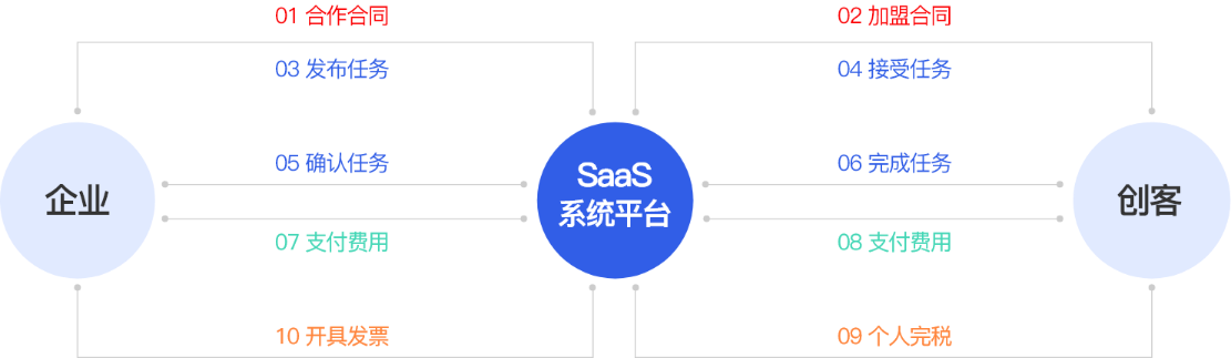 将客户、人力资源外包服务商、项目经理人、新业态从业人员之间的业务关系进行系统化构建,为客户提供增值税专用发票。